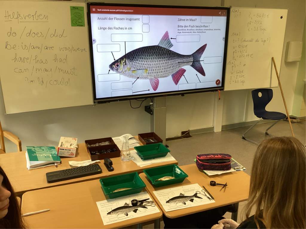 Einen sehr praktischen Ausflug in die Welt der Lebewesen unternahm der Wahlpflichtkurs Biologie im Jahrgang 8 an der DBRS. Im Rahmen der Thematik "Ökosystem See" konnten die Schüler und Schülerinnen ein Lebewesen aus dem Lebensraum See hautnah begutachten und lernten anatomische Besonderheiten kennen und konnten die besonderen Anpassungen eines Fisches an seinen Lebensraum nachvollziehen. Alle Schülerinnen und Schüler untersuchten eine bereitgestellte Rotfeder (Scardinius erythrophthalmus), einen in unseren heimische Gewässern häufig vorkommenden und sehr hübsch anzusehenden Weißfisch. Nach einer kurzen Entdeckungsphase wurden die Fische eingehend mit Schutzhandschuhen, Präparierbesteck und Vergrößerungsgläsern auf ihre äusseren Merkmale hin untersucht. Weiterführend wurden die Fische dann präpariert, um die inneren Organe wie Herz, Kiemen oder Schwimmblase genauer anzuschauen. Besonders hilfreich war trotz des praktischen Anteils die moderne Digitalausstattung der Schule - Filmsequenzen machten die Fische im Wasser "erlebbar", Präparationsanleitungen waren für alle überlebensgroß im Klassenraum präsent.