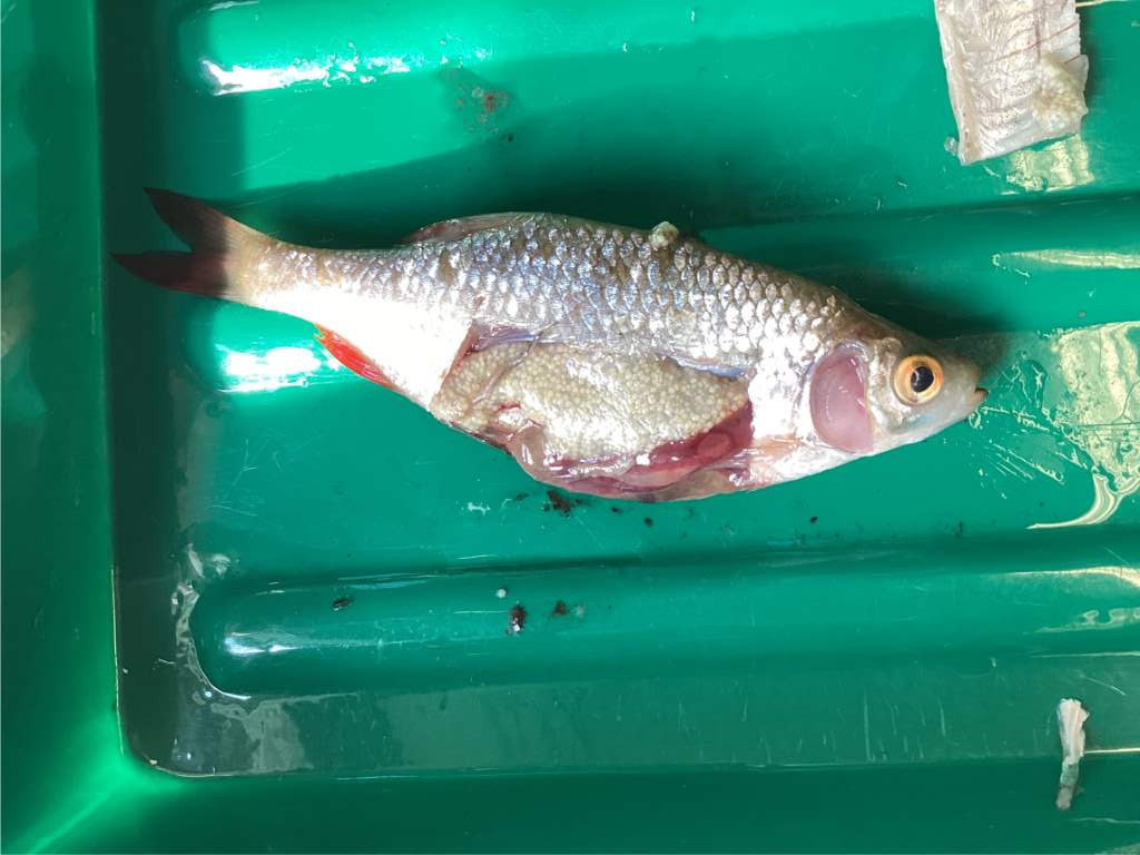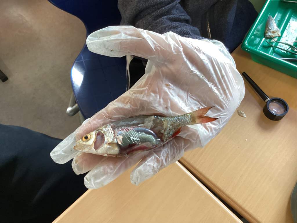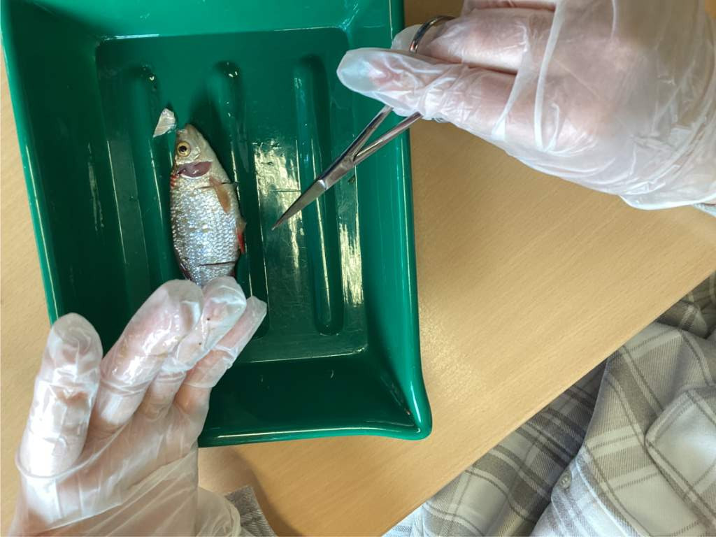 Dabei konnten die Schülerinnen und Schüler viele interessante Endeckungen machen: 40 Schuppen befinden sich entlang des Seitenlinienorgangs, die Schwimmblase ist mit Luft gefüllt und zweiteilig, Rotfedern haben keine Zähne und auf den Schuppen befinden sich Jahresringe - genau wie bei Bäumen.